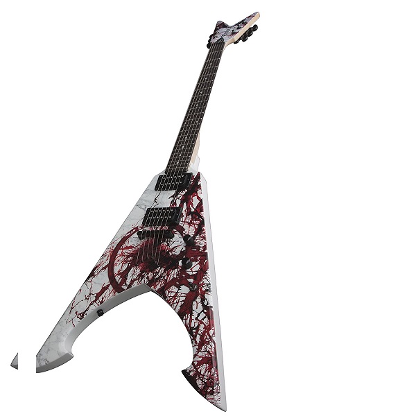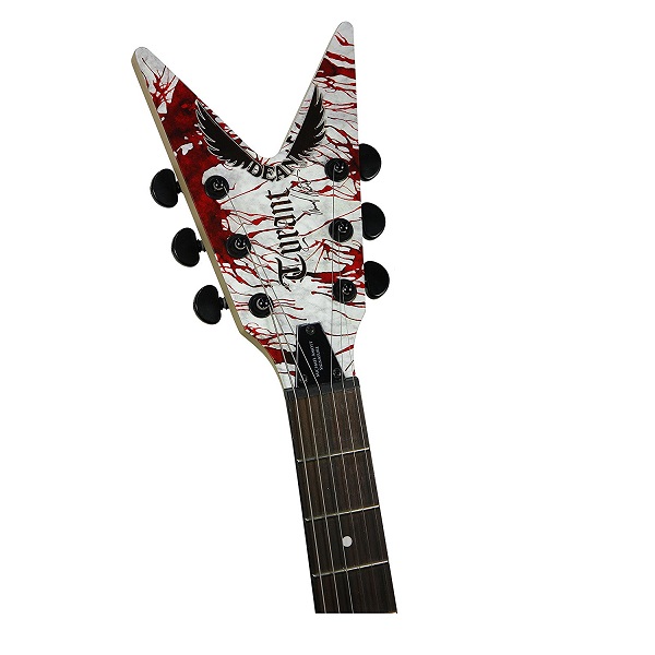 MICHAEL AMOTT SIG. TYRANT Splatter. Basswood . Mahogany Top / Body. 24-3/4″ Scale. Set Mahogany Neck. Ebony Fingerboard. Pearl Valknut Inlays. Grover Tuners. Black Hardware. Tune-O-Matic Bridge. USA Dean DMT Amott “Tyrant” Bridge Pickup. USA Dean DMT Amott “Time Capsule” Neck Pickup. Hardshell Case Included. Finishes: “Bloodstorm” Custom Graphic